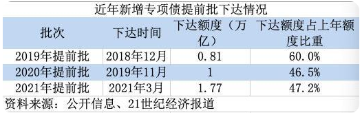 從額度下達時點看,2019年提前批、2020年提前批額度均在上一年末下達,2021年由于穩增長壓力不大,其提前批額度在3月“兩會”召開前下達。