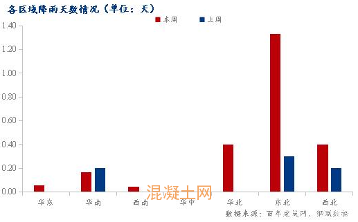 根據(jù)當(dāng)周影響混凝土產(chǎn)量的降雨天數(shù)來看,本周影響混凝土出貨量的平均降雨天數(shù)不足1天。各地區(qū)近期受雨水天氣影響較小,攪拌站出貨情況本周與天氣因素關(guān)聯(lián)性不大。隨著寒潮天氣影響逐漸擴(kuò)大,預(yù)計(jì)后期工程進(jìn)度會(huì)有所放緩,本周東北地區(qū)暴雪天氣明顯增加,混凝土出貨量大幅降低。