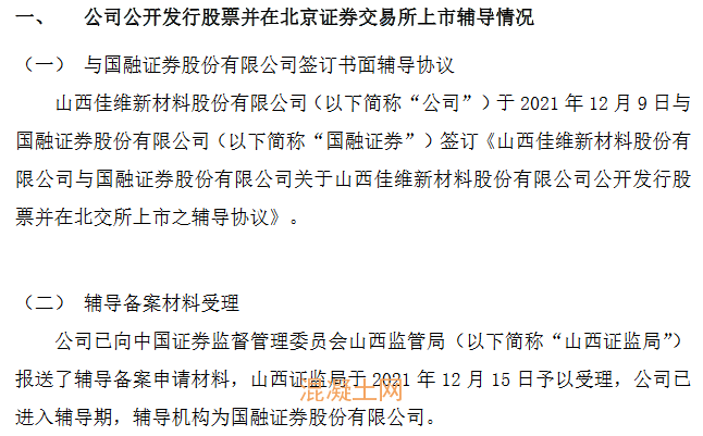 12月9日,佳維股份與國融證券簽署在北交所上市的輔導協議,并于近日向山西證監局報送了輔導備案申請材料,于12月15日獲受理。目前,公司已進入北交所上市輔導階段,輔導機構為國融證券。