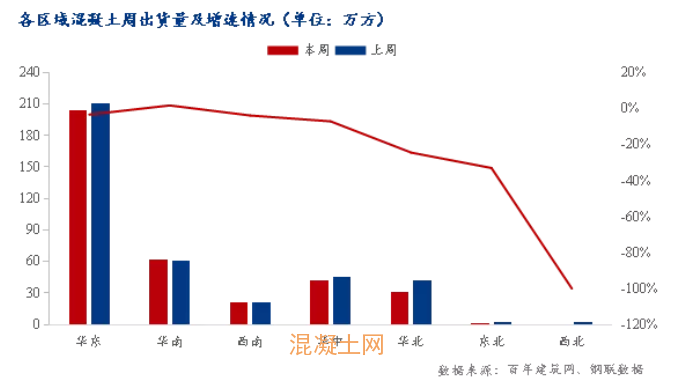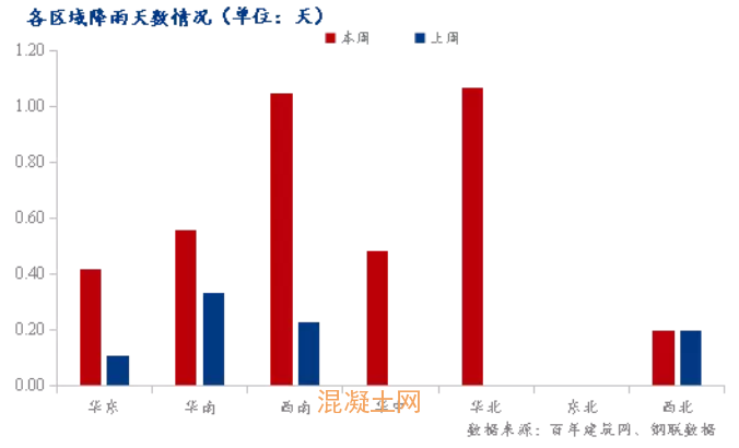 根據當周影響混凝土產量的降雨天數來看,本周影響混凝土出貨量的平均降雨天數為0.6天。各地區降雨天氣增加,華北雨雪天氣較多,下游施工進度受阻;東北地區本周暫無雨雪天氣,但因氣溫較低,大半混凝土企業已經停產,出貨量大幅下滑;其他各地雨雪天氣均有明顯增加,后期雨雪天氣對施工進度的影響將逐步減少,但氣溫或將維持跌勢,至年前全國混凝土出貨量難有漲勢。