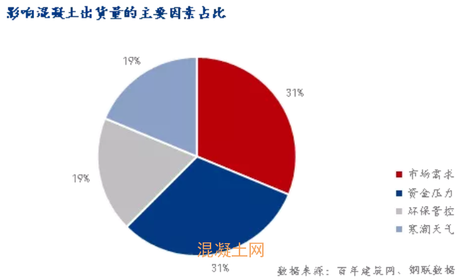 據本周調研的混凝土企業反饋,本期市場需求及資金壓力依然是影響混凝土出貨情況的“兩大巨頭”,各自占總影響力的31%,接近年底,全國各地施工方均有資金流轉困難的問題,而混凝土市場需求則呈現南增北減的態勢,下游施工“南趕北停”的情況下,混凝土產能利用率也隨之變動;19%的混凝土企業反饋本周環保管控進一步加嚴,部分區域下游一周停工3-4天,攪拌站也相應提供,混凝土市場進入供需雙弱的狀態;19%的混凝土企業反饋因寒潮天氣持續,施工進度受阻,且氣溫降低影響混凝土凝結時間,攪拌站出貨積極性隨之降低。