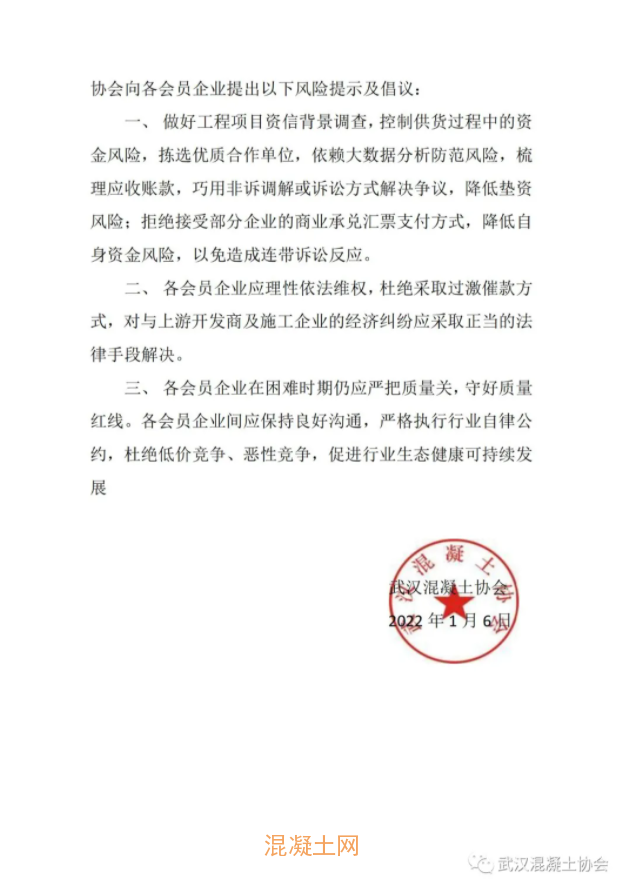 鑒于當前武漢混凝土行業面臨的種種困境,武漢混凝土協會發布《關于我市預拌混凝土行業現狀及風險提示》,全文如下: