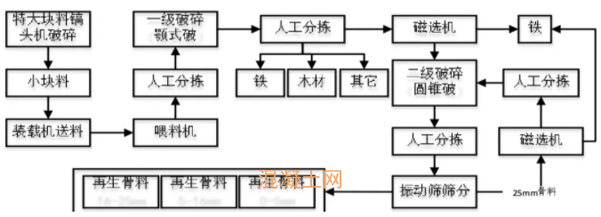 再生產品包括碎石(5mm~25mm)、細石(5mm~16mm)、機制砂(0.315mm~5mm)等。這些規格的原料經試驗室專項檢驗,按照不同比例配比,可進入商品混凝土、市政道路工程路面水穩層用料等生產線。另外,鋼筋、三角鐵、扁鐵、鐵釘等金屬物可被回收利用,被回收的廢棄混凝土已經達到100%處置、95%利用。