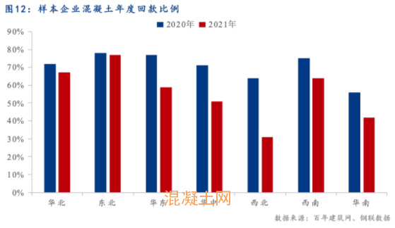 據(jù)調(diào)研結(jié)果顯示,2020年調(diào)研樣本混凝土凝土企業(yè)平均回款比例在70%,而21年全國(guó)調(diào)研相關(guān)攪拌站回款比例在56%,較去年降低14%。其中西北地區(qū)回款同比下降最多,21年回款率為31%,同比降低52%;華中和華中地區(qū)混凝土企業(yè)今年回款率分別為59%和51%,同比降低23%和28%,西南地區(qū)混凝土企業(yè)今年回款率達(dá)64%,同比降低15%,華南地區(qū)42%,同比降低25%,華北和東北地區(qū)回款率分別達(dá)67%和77%,同比無明顯降低,分別為7%和1%。