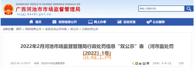2月15日,廣西河池市市場監管局網站發布2022年2月行政處罰信息“雙公示”表 (河市監處罰〔2022〕1號),涉及廣西虎鷹水泥有限公司。