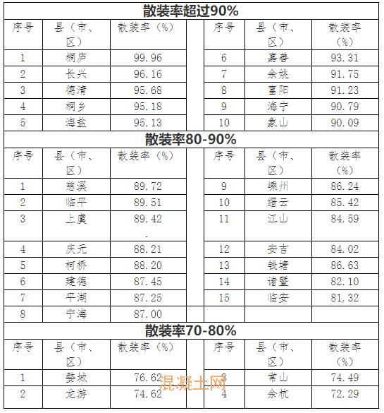 2021年,全省水泥散裝率85.38%,同比提高1.32個百分點,超額完成水泥散裝率84.50%的指導目標,繼續位居全國各省區第二名。其中,列入散裝率考核的8個設區市散裝率依次為嘉興93.83%、湖州93.64%、寧波90.11%、杭州89.02%、麗水85.27%、紹興85.16%、衢州78.90%、金華70.81%;散裝率同比提高依次為金華3.70個百分點、麗水3.69個百分點、湖州2.74個百分點、衢州2.13個百分點、嘉興1.91個百分點、紹興1.62個百分點、杭州1.10個百分點、寧波0.03個百分點。縣(市、區)排名見下表: