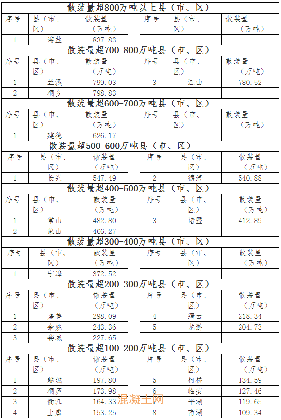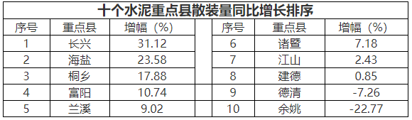 富陽、建德、余姚、海鹽、桐鄉、德 清、長興、諸暨、蘭溪、江山十個水泥重點縣(市、區)水泥產量7038.97萬噸,占全省總量51.69%,同比增加376.68萬噸,增長5.65%;散裝水泥供應量5335.47萬噸,占全省總量45.89%,同比下降314.84萬噸,負增長5.57%。詳見下表: