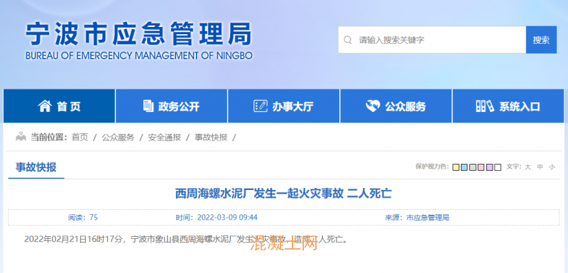 3月9日,浙江省寧波市應(yīng)急管理局發(fā)布消息,2022年02月21日16時17分,寧波市象山海螺水泥廠發(fā)生火災(zāi)事故,造成兩人死亡。