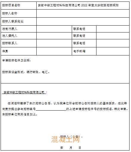 4.1凡有意參加投標(biāo)者,請于2022年4月6日至2022年4月11日,每日上午 9:00 時至 12:00 時,下午 13:30 時至 17:00 時(北京時間,下同;節(jié)假日除外),在安徽省合肥市宿松路1188號中鐵科技大樓東樓703室持投標(biāo)申請表、本人身份證明、營業(yè)執(zhí)照副本購買招標(biāo)文件。