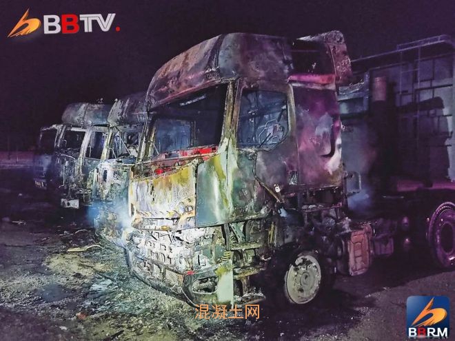 其中3輛自卸貨車車頭已經(jīng)被完全燒穿,損毀嚴(yán)重,另外一輛攪拌車被波及,不同程度損毀。