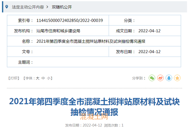 2022年4月11日,廣東省汕尾市住房和城鄉建設局發布2021年第四季度全市混凝土攪拌站原材料及試塊抽檢情況通報。