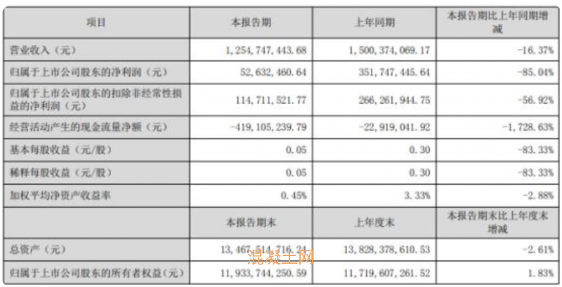 4月22日,塔牌集團(002233)發布2022年第一季度報告,報告期內公司實現營業收入1,254,747,443.68元,同比下滑16.37%;歸屬于上市公司股東的凈利潤52,632,460.64元,同比下滑85.04%。