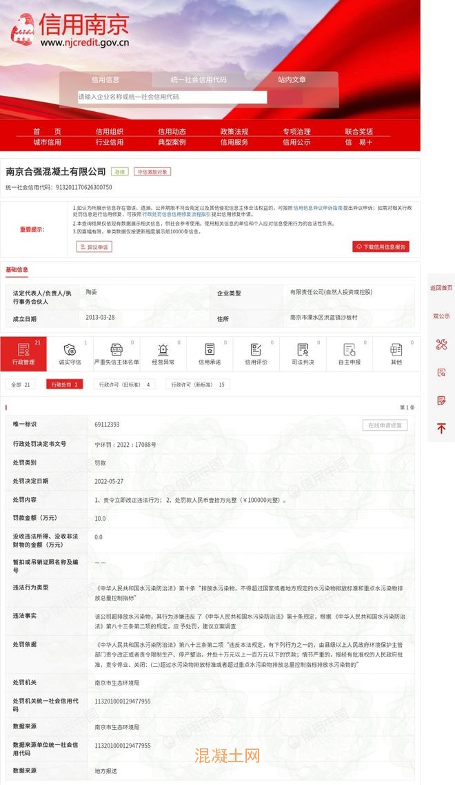 5月27日,南京市生態(tài)環(huán)境局作出寧環(huán)罰﹝2022﹞17088號(hào)處罰決定書(shū),南京合強(qiáng)混凝土有限公司違反《中華人民共和國(guó)水污染防治法》被處罰10萬(wàn)元。