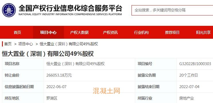 6月7日,從全國產權行業信息化綜合服務平臺獲悉,中國鐵建(601186)(601186.SH)子公司中國鐵建投資集團有限公司掛牌出售恒大置業(深圳)有限公司(以下簡稱恒大置業深圳)49%股權,轉讓底價26.6億元。剩余51%股份,則由恒大地產集團(深圳)有限公司持有。披露公告期合計20個工作日。