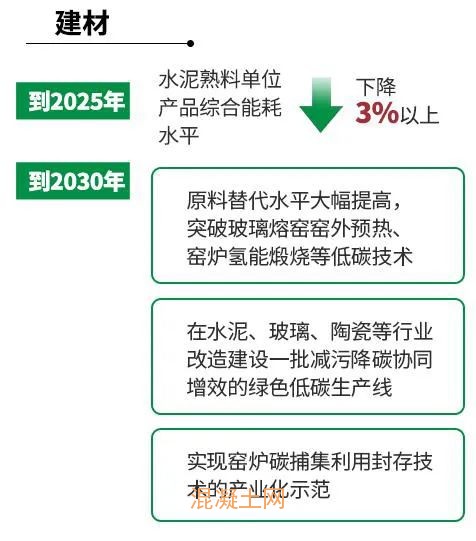 建材行業是工業領域碳達峰重點行業。在重點行業達峰行動中,《實施方案》要求,建材行業要嚴格執行水泥、平板玻璃產能置換政策,依法依規淘汰落后產能;加快全氧、富氧、電熔等工業窯爐節能降耗技術應用,推廣水泥高效篦冷機、高效節能粉磨、低阻旋風預熱器、浮法玻璃一窯多線、陶瓷干法制粉等節能降碳裝備;到2025年,水泥熟料單位產品綜合能耗水平下降3%以上;到2030年,原燃料替代水平大幅提高,突破玻璃熔窯窯外預熱、窯爐氫能煅燒等低碳技術,在水泥、玻璃、陶瓷等行業改造建設一批減污降碳協同增效的綠色低碳生產線,實現窯爐碳捕集利用封存技術產業化示范。