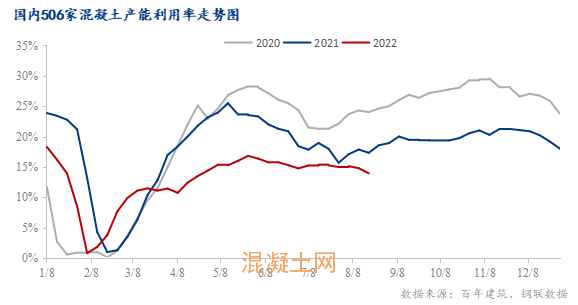 截至8月17日,跟蹤國內混凝土企業出貨情況,本周國內500余家混凝土發運量小幅回落,8月11日-8月17日期間,混凝土平均產能利用率為13.93%,周環比降低0.86個百分點,低于去年同期3.39個百分點,差值較上輪再次擴大。本輪,國內南方部分地區出現史上最高溫,各地也出臺了有序用電措施,部分工地受此影響處于停工狀態,加之北方地區受持續的降雨影響,工地施工進度緩慢,混凝土發運量持續低位。