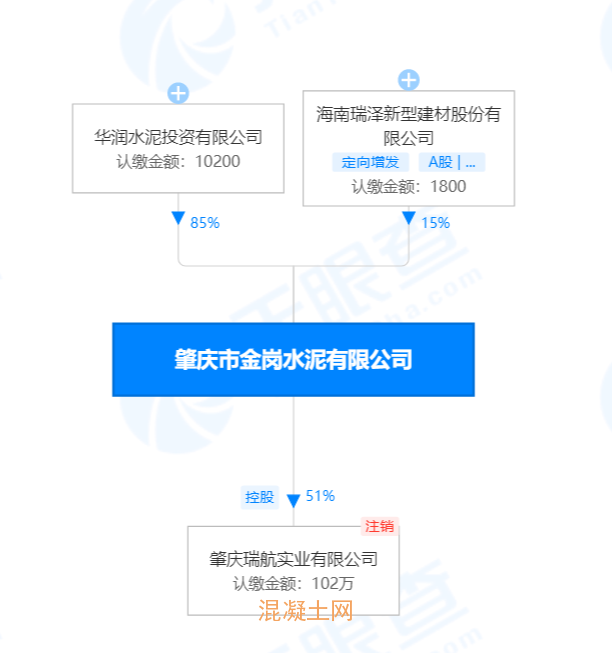 天眼查APP顯示,肇慶市金崗水泥有限公司(曾用名: 高要市金崗水泥有限公司), 成立于2002年, 海南瑞澤成員, 位于廣東省肇慶市, 是一家以從事批發業為主的企業。企業注冊資本1562.5萬人民幣, 并已于2022年完成了擬收購, 交易金額5.4億人民幣。