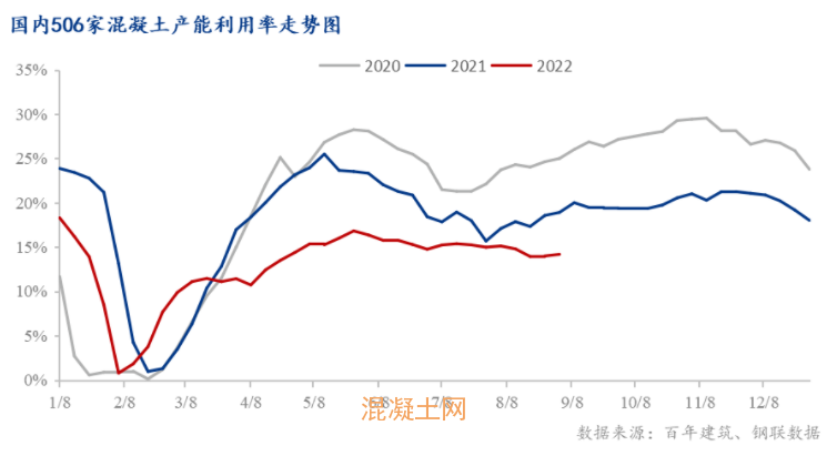 樣本說明:本輪調研時間為8月25日-8月31日,樣本總量為506個混凝土攪拌站,區域占比:華東23.28%、華中16.43%、華南17.12%、華北21.23%、西南15.1%、西北2.7%、東北4.14%;產能利用率=周產量/周設計產能;混凝土企業正常平均產能利用率維持在30%左右。