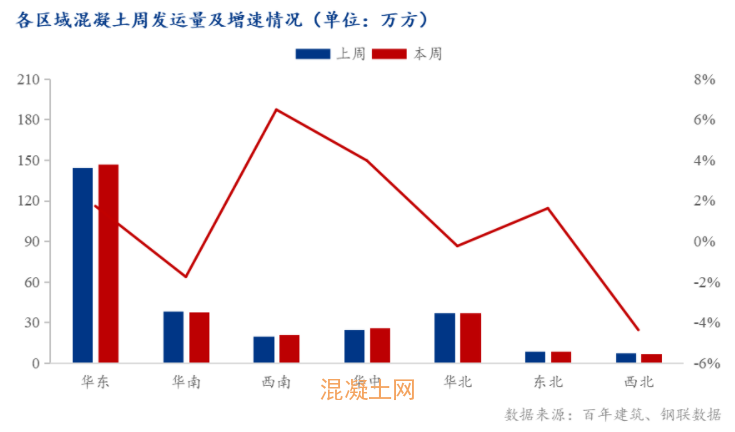 本周調研企業混凝土周度發運量為284.1萬方。較上周增加3.83萬方,混凝土發運量小幅提升。全國各地區除華南、西北受疫情形勢嚴峻影響工地施工和材料運輸受限保持跌勢,其他各地區混凝土發運量均有不同程度地回升。本次增幅最大的西南地區,尤其川渝兩地氣溫回落,工地和企業用電緊張狀態有所緩解,生產時長有所利好對材料需求亦有所提升,混凝土發運量增幅在6%;而華中地區本輪增幅在4%,但幾地情況卻各不相同,河南降溫后雨水隨之而來,加之新開工數量明顯不足,發運量繼續維持低位、湖北高溫天氣緩解發運量有所回升但受疫情反復影響,后期提升幅度有限;華北和華東地區本期發運量增幅在2%,華北北京地區企業反饋安置房項目開工情況較好,對混凝土需求有所提升,但河北和天津兩地仍陷疫情和項目資金困局,混凝土發運繼續小幅走低。