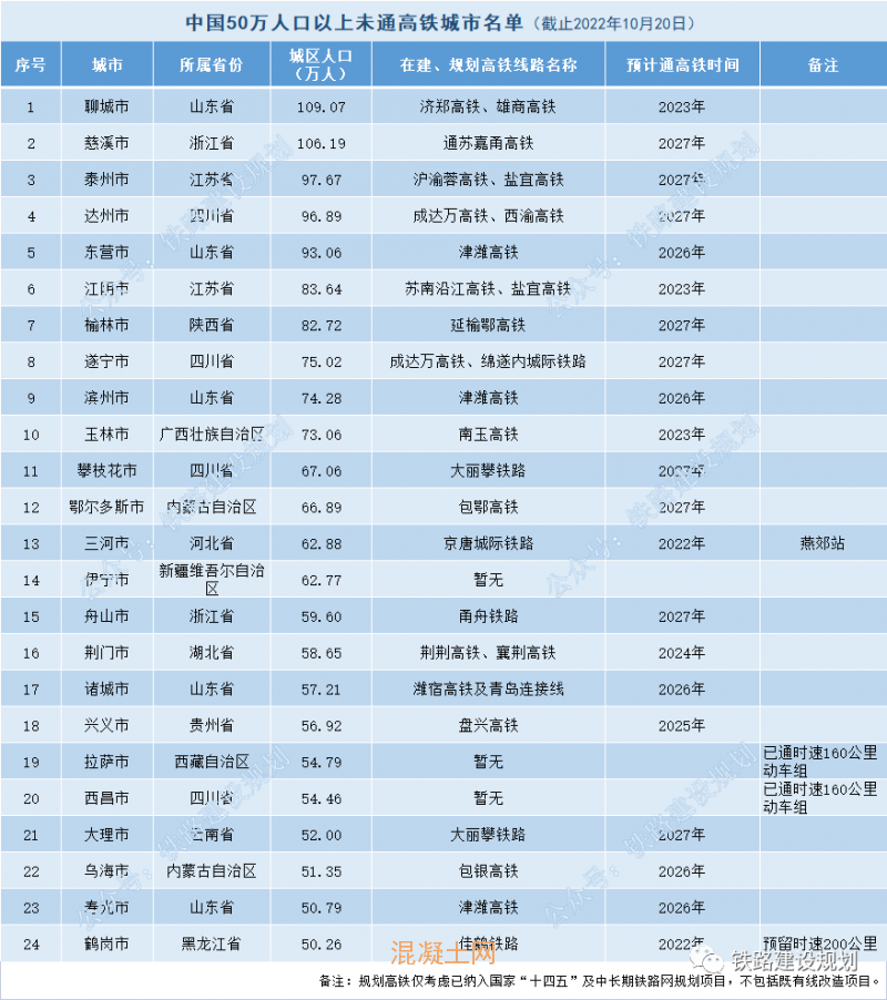 50萬人口以上城市未通高鐵、20萬人口以上城市未通鐵路名單(不含港澳臺)及通車計劃如下(勘誤:表1刪除大理市;表2增加石獅市):