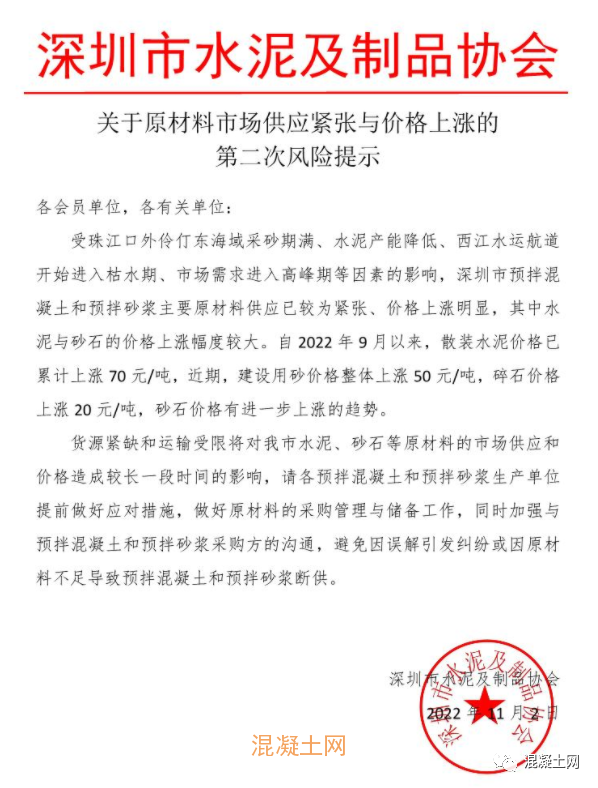 11月2日深圳市水泥及制品協(xié)會發(fā)布《關(guān)于原材料市場供應(yīng)緊張與價格上漲的第二次風(fēng)險提示》稱,受采砂期滿、水泥產(chǎn)能降低、西江水運航道開始進(jìn)入枯水期、市場需求進(jìn)入高峰期以及水泥、砂石報價上漲等因素的影響,珠三角區(qū)域局部市場出現(xiàn)材料供應(yīng)緊張情況。
