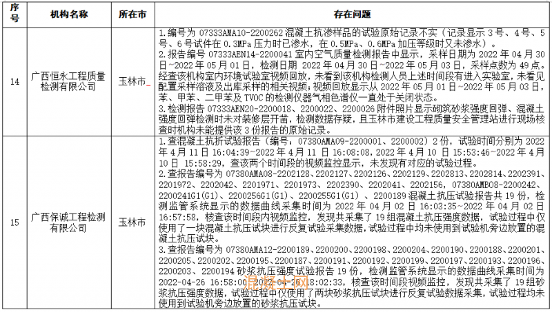 (一)存在偽造檢測數據,出具虛假檢測報告的行為。 一是通過視頻監控錄像,未能查詢到部分檢測機構出具的檢測報告所對應的檢測過程,如廣西百潤工程檢測有限公司等。二是部分檢測機構未按標準要求留置72小時內已檢試件,或留置的樣品狀態未達到標準要求卻進行了檢測,如鹿寨縣飛鹿建筑材料檢測有限責任公司等。三是樁基載荷試驗報告所附檢測數據、曲線與上傳至檢測監管系統中的數據不一致,如廣西佐飛檢測有限公司等。四是部分試驗參數原始記錄缺失或原始記錄不實,如廣西恒永工程質量檢測有限公司等。五是部分檢測機構用混凝土試塊替代砌體試件、混凝土芯樣進行力學試驗數據采集,或者使用同一試件進行多次數據采集,如廣西保誠工程檢測有限公司等。六是超出檢驗檢測機構資質認定范圍出具檢測報告,如廣西立友工程檢測有限公司等。
