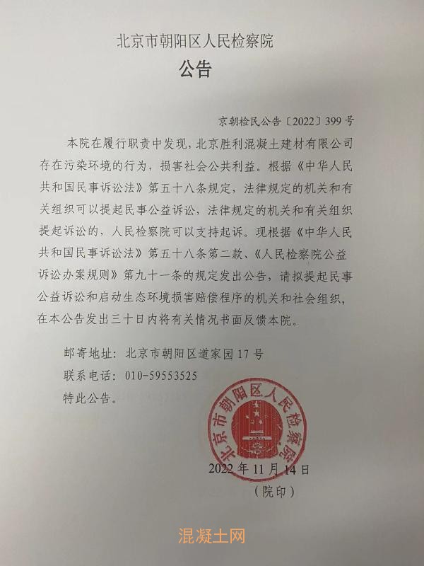 本院在履行職責(zé)中發(fā)現(xiàn),北京勝利混凝土建材有限公司存在污染環(huán)境的行為,損害社會(huì)公共利益。根據(jù)《中華人民共和國民事訴訟法》第五十八條規(guī)定,法律規(guī)定的機(jī)關(guān)和有關(guān)組織可以提起民事公益訴訟,法律規(guī)定的機(jī)關(guān)和有關(guān)組織提起訴訟的,人民檢察院可以支持起訴。現(xiàn)根據(jù)《中華人民共和國民事訴訟法》第五十八條第二款、《人民檢察院公益訴訟辦案規(guī)則》第九十一條的規(guī)定發(fā)出公告,請(qǐng)擬提起民事公益訴訟和啟動(dòng)生態(tài)環(huán)境損害賠償程序的機(jī)關(guān)和社會(huì)組織,在本公告發(fā)出三十日內(nèi)將有關(guān)情況書面反饋本院。
