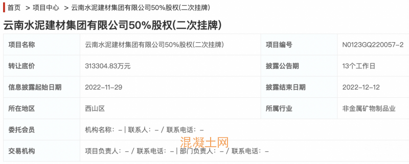 11月29日,據全國產權行業信息化綜合服務平臺,昆明鋼鐵控股有限公司(以下簡稱“昆明鋼鐵控股”)掛牌轉讓云南水泥建材集團有限公司(以下簡稱“云南水泥建材集團”)50%股權,轉讓底價約31.33億元,信息披露起止日為2022年11月29日至2022年12月12日。