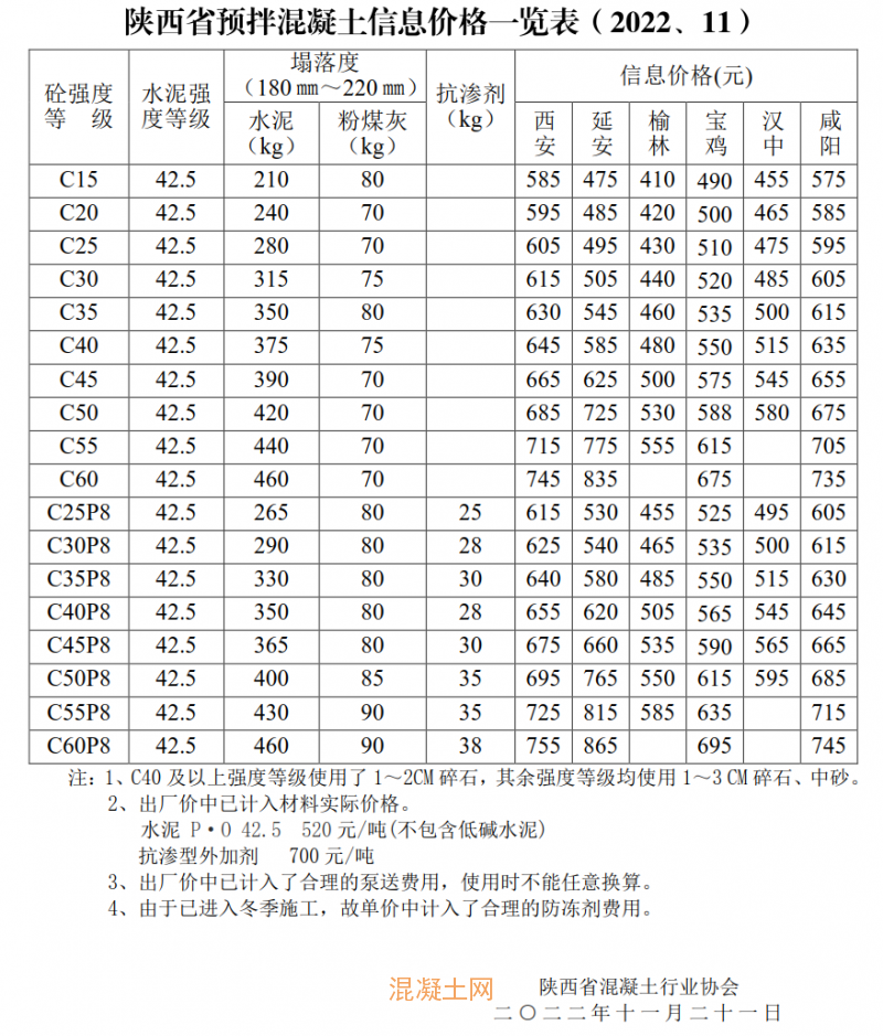 陜西省預拌混凝土信息價格一覽表(2022、11)