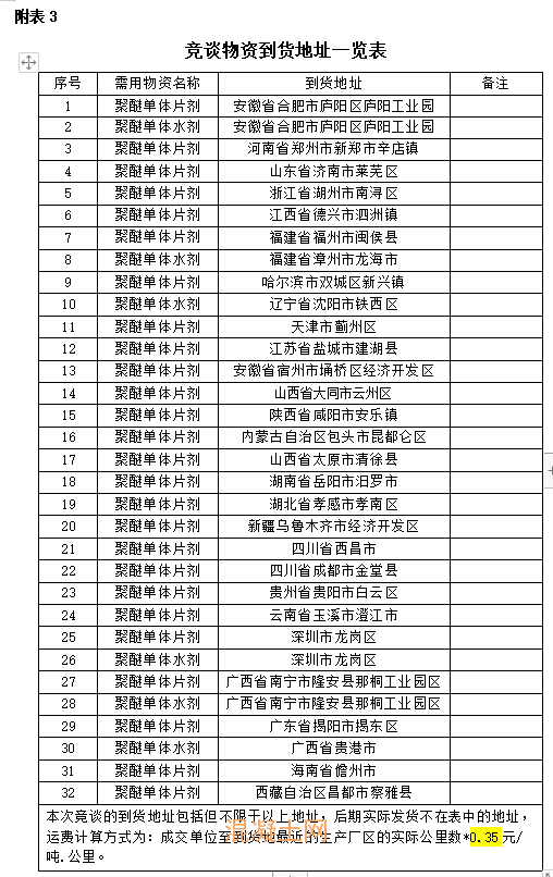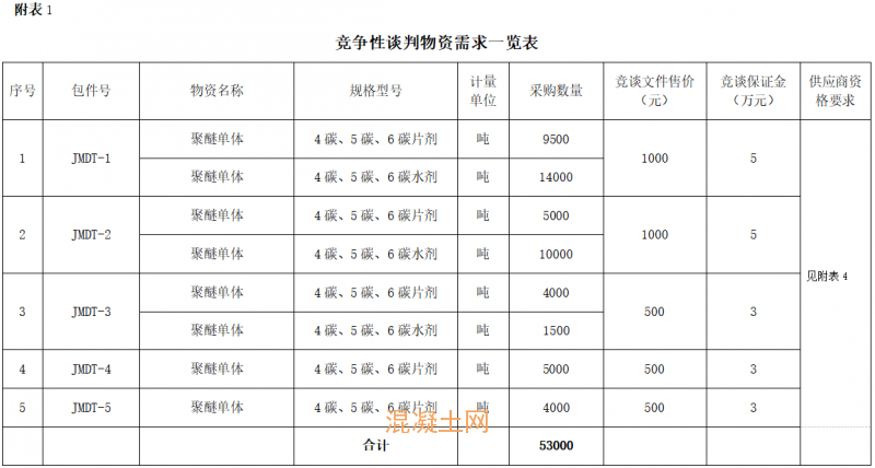 本次競爭性談判物資為安徽中鐵工程材料科技有限公司(含安徽中鐵工程材料科技有限公司深圳分公司、安徽中鐵工程材料科技有限公司西藏分公司)和云南中鐵新材料科技有限公司兩家采購單位2023年度聚羧酸減水劑生產(chǎn)所需的聚醚單體,采購數(shù)量為4碳、5碳、6碳單體水劑2.55萬噸,片劑2.77萬噸(其中包件JMDT-5與云南中鐵新材料科技有限公司簽訂合同)。到貨地址包含合肥、湖州、咸陽、澄江、成都、沈陽、深圳等生產(chǎn)基地(具體到貨地址見附表3)。