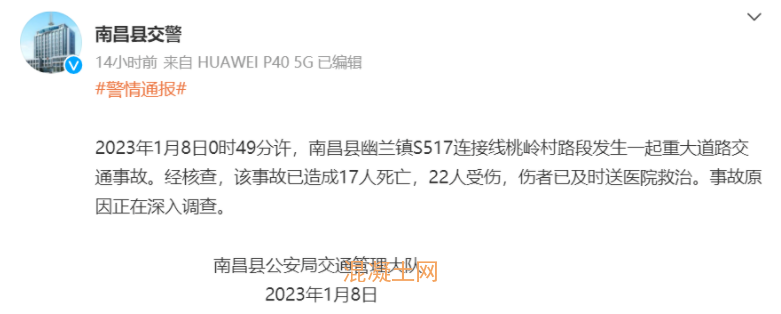 當地居民提供的官方通報稱,2023年1月8日0時50分,在南昌縣幽蘭鎮桃嶺村紅溪章家自然村發生一起重大交通事故,一輛重型半掛牽引車(屬于樂平某物流公司),撞上出殯隊伍,初步掌握,事故已造成17人死亡、22人受傷,傷者已送往醫院搶救,車輛核載質量32700KG,車輛裝載砂石。