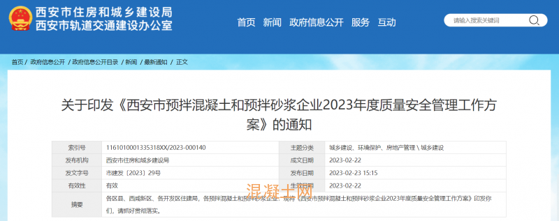 為認真貫徹落實黨的二十大精神和習近平總書記關于安全生產的一系列重要批示指示精神,按照省、市關于復工復產安全生產工作相關要求,結合我市預拌混凝土及預拌砂漿行業實際,現就西安市2023年度預拌混凝土和預拌砂漿企業(簡稱“兩類企業”)質量安全管理工作安排如下。