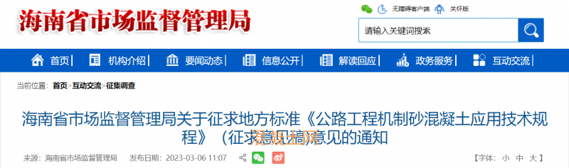 關于征求地方標準《公路工程機制砂混凝土應用技術規程》(征求意見稿)意見的通知