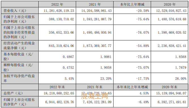 4月14日,萬年青(SZ000789,股價9.03元,市值72億元)披露了2022年年報,公司2022年實現營業總收入112.82億元,同比下降20.6%;實現歸母凈利潤3.88億元,同比下降75.6%;基本每股收益為0.49元。
