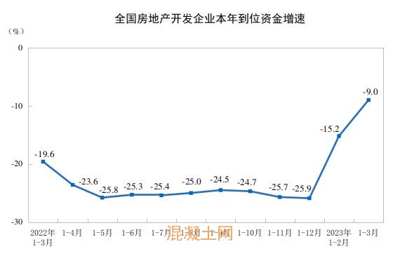 1—3月份,房地產開發企業到位資金34708億元,同比下降9.0%。其中,國內貸款4995億元,下降9.6%;利用外資8億元,下降22.7%;自籌資金10171億元,下降17.9%;定金及預收款11909億元,下降2.8%;個人按揭貸款6188億元,下降2.9%。