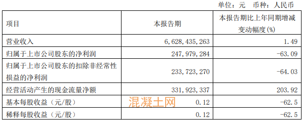 華新水泥(600801)4月27日晚間披露一季報,一季度實現營業收入66.28億元,同比增長1.49%;凈利潤2.48億元,同比下降63.09%;基本每股收益0.12元。受市場需求影響,主要產品水泥量價下降。