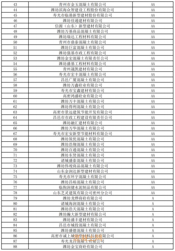 山東濰坊市2022年度預拌混凝土企業信用評價等級(229家)