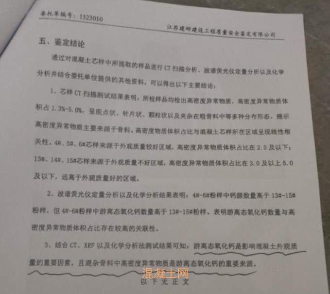 “游離態氧化鈣是影響混凝土外觀質量的重要因素,且混雜骨料中高密度異常物質是游離態氧化鈣的重要來源。”檢測報告顯示。
