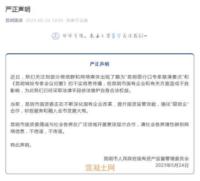 5月24日,昆明市人民政府國有資產監督管理委員會發布聲明稱,近日,關注到部分微信群和網絡媒體出現了題為“昆明銀行口專家路演要點”和《昆明城投專家會議紀要》的不實信息傳播,給昆明市國有企業和有關方面造成不良影響,為此已經采取法律手段依法維護自身合法權益。
