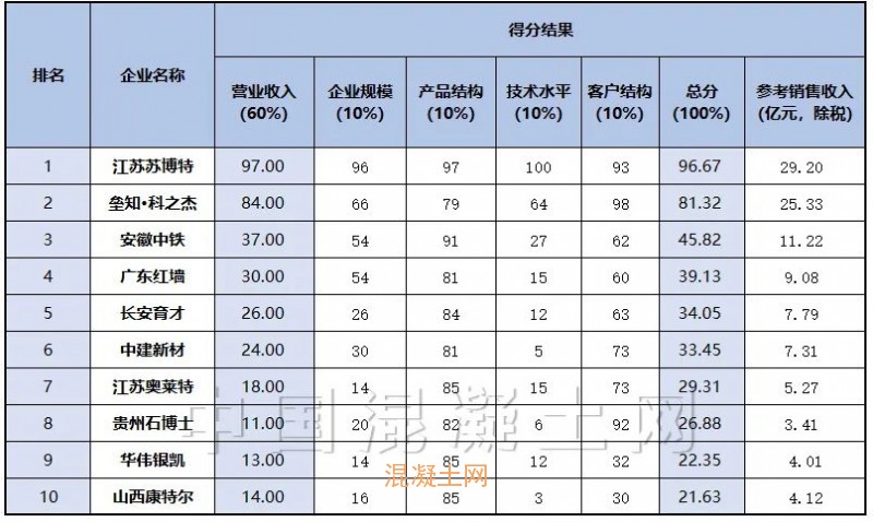 中國混凝土網(wǎng)此次評選出的外加劑企業(yè)綜合十強(qiáng)是經(jīng)多方調(diào)查統(tǒng)計(jì),搜集了國內(nèi)大型重點(diǎn)外加劑企業(yè)的銷售收入、企業(yè)規(guī)模等數(shù)據(jù),以2022年各企業(yè)實(shí)際銷售額為依據(jù),經(jīng)過對各項(xiàng)數(shù)據(jù)的權(quán)重比較得出最終排名數(shù)據(jù)主要來自各外加劑企業(yè)上報(bào)、企業(yè)年報(bào)以及政府審計(jì)報(bào)告。