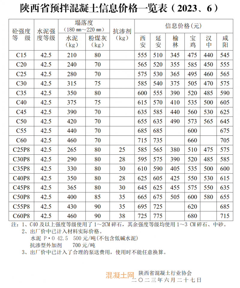 陜西省預拌混凝土信息價格一覽表(2023、6)