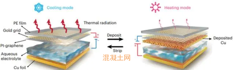此次,研究人員設計了一種不可燃的“電致變色”建筑材料,它包含一個可呈現兩種構象的層:保持大部分紅外線熱的固態銅,或發射紅外線的水溶液。在任何選定的觸發溫度下,該設備都可使用少量電力,通過將銅沉積到薄膜中或剝離銅來誘導狀態之間的化學變化。