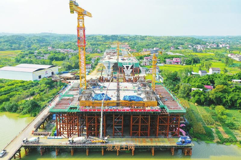 全長1010米的沱江大橋主梁最寬處79米,建成后將超過目前吉尼斯世界紀錄最寬斜拉橋——橋寬67.3米的埃及萬歲大橋,成為新的“最寬”。為了確保這么寬的橋梁建設剛度,塔梁固結段使用了RPC混凝土,其單體構件最大尺寸達4米×7米×48米,是目前民用領域最大體積的RPC主體結構。
