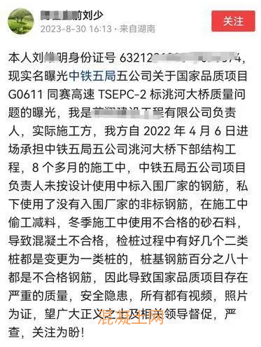 8月30日,舉報者劉先生在網上實名舉報中鐵五局在國家品質項目G0611同賽高速洮河大橋標段偷工減料,以次充好,未按設計要求使用中標入圍企業的國標鋼筋,而是采用其他廠家的非標產品。另外在冬季施工中,采用不合格砂石料,導致混凝土不合格,二類樁變更成一類樁,樁基80%都是不合格鋼筋,存在嚴重的安全隱患。