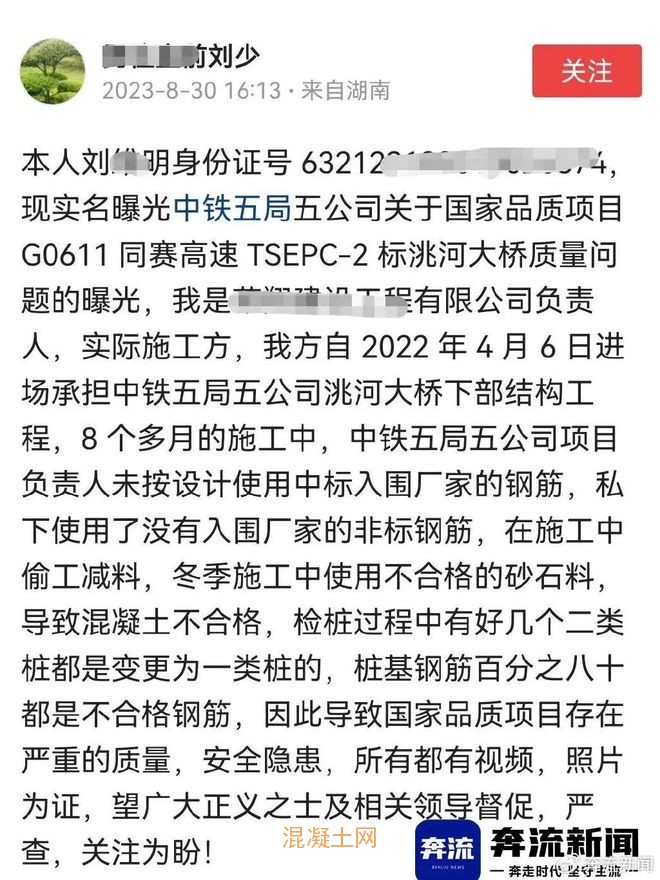 近日,有網(wǎng)友實名舉報中鐵五局五公司承建的青海省同(同仁)賽(賽爾龍)高速TSEPC-2標段洮河大橋施工過程中存在質(zhì)量問題:“未按設(shè)計使用中標入圍廠家的鋼筋,私下使用了沒有入圍廠家的非標鋼筋,在施工中偷工減料,冬季施工中使用不合格的砂石料,導致混凝土不合格。”