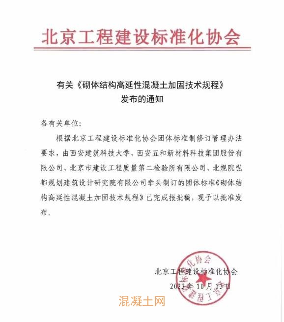 2023年10月13日,由西安建筑科技大學、西安五和新材料科技集團股份有限公司等單位主編的北京團體標準《砌體結(jié)構高延性混凝土加固技術規(guī)程》(編號為T/BECS 0001—2022)(以下簡稱《規(guī)程》)獲得批準發(fā)布。