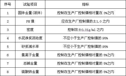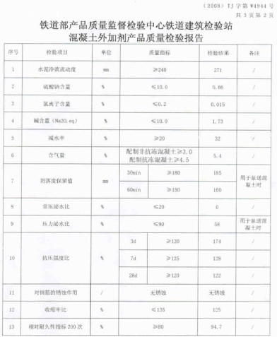 產品主要執行GB8076-1997《混凝土外加劑》標準及鐵道部科技基[2005]101號《客運專線高性能混凝土暫行技術條件》和科技技[2006]104號《客運專線高性能混凝土用外加劑產品檢驗細則》,以及JG/T223-2007《聚羧酸系高性能減水劑》標準,各項性能指標均達到上述標準要求。