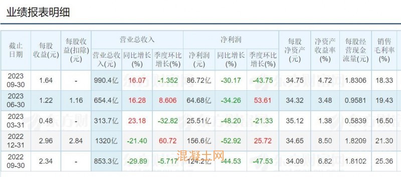 海螺水泥10月27日發布2023年第三季度報告,前三季度實現營業收入990.43億元,同比增長16.07%;歸屬于上市公司股東的凈利潤86.72億元,同比下降30.17%。