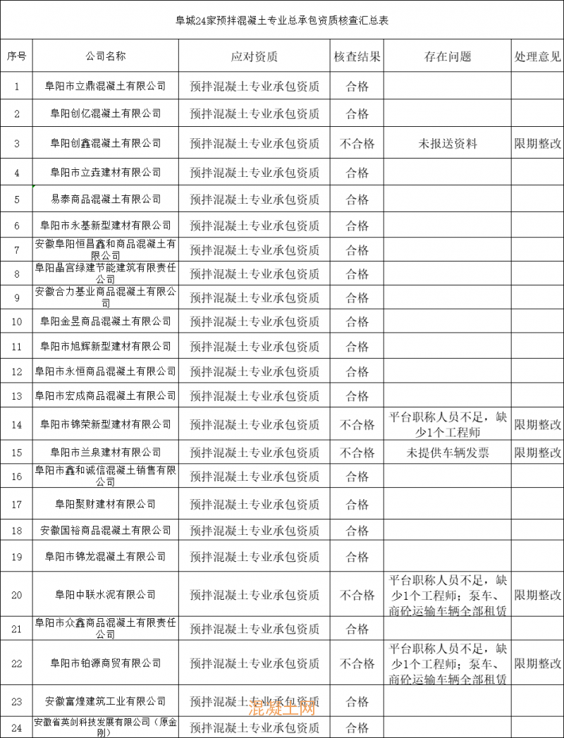 本次采取平臺信息核查、資料核查與屬地核查相結(jié)合方式,重點核查了企業(yè)資質(zhì)信息、人員信息和企業(yè)提供的設(shè)備發(fā)票等情況,全市共核查95家預拌混凝土企業(yè),其中核查合格企業(yè)44家(阜城20家,潁上縣7家;阜南縣10家;臨泉縣5家;太和縣1家;界首市1家)。阜城預拌混凝土企業(yè)協(xié)查情況詳見附件《2023年度阜城預拌混凝土專業(yè)承包資質(zhì)核查結(jié)果一覽表》,各縣(市)核查不合格企業(yè)由屬地住建局予以公布并督促按時完成整改。
