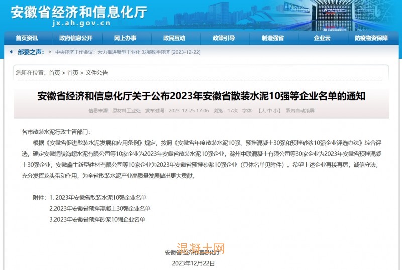 近日,安徽省經濟和信息化廳公布了2023年安徽省散裝水泥10強、預拌混凝土30強、預拌砂漿10強等企業名單。